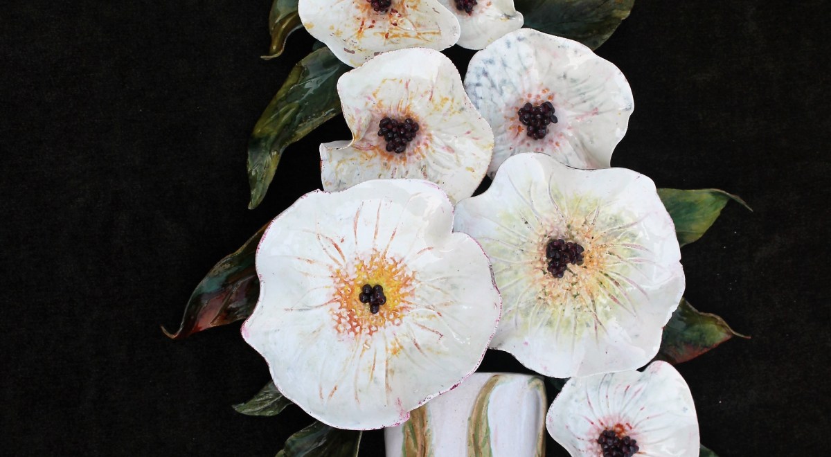 The clay flowers are made from stoneware or porcelain clay, fired at 2200F in final kiln firing. I also utilized recycled glass, reclaimed wood, driftwood, found objects, and paintings create this series of work.