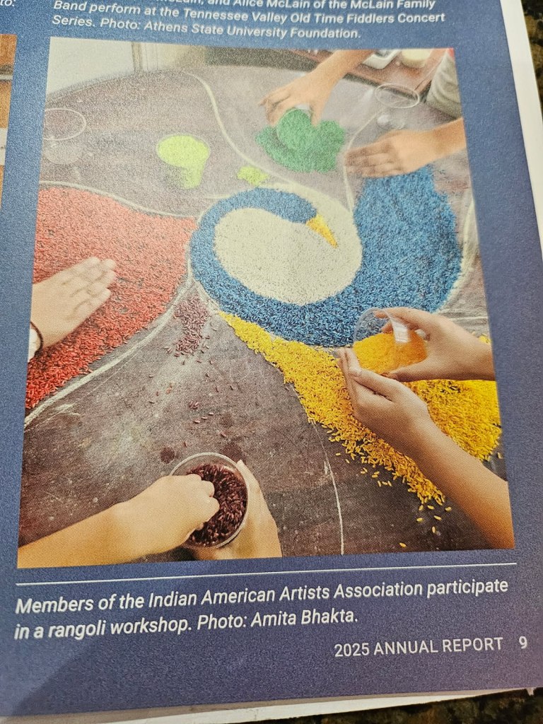 I have had the honor of receiving a fellowship grant (multiple times) from the state of Alabama to teach Rangoli to children of Indian descent with the hopes of carrying on the tradition. Alabama Public Television (APT) featured this work on Rangoli in their show “Alabama Journey Proud”.