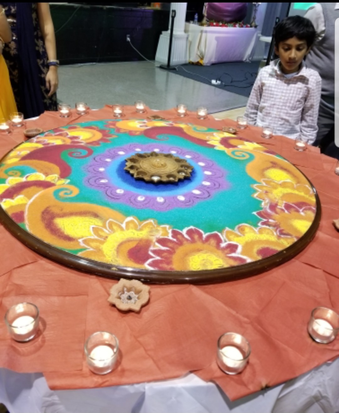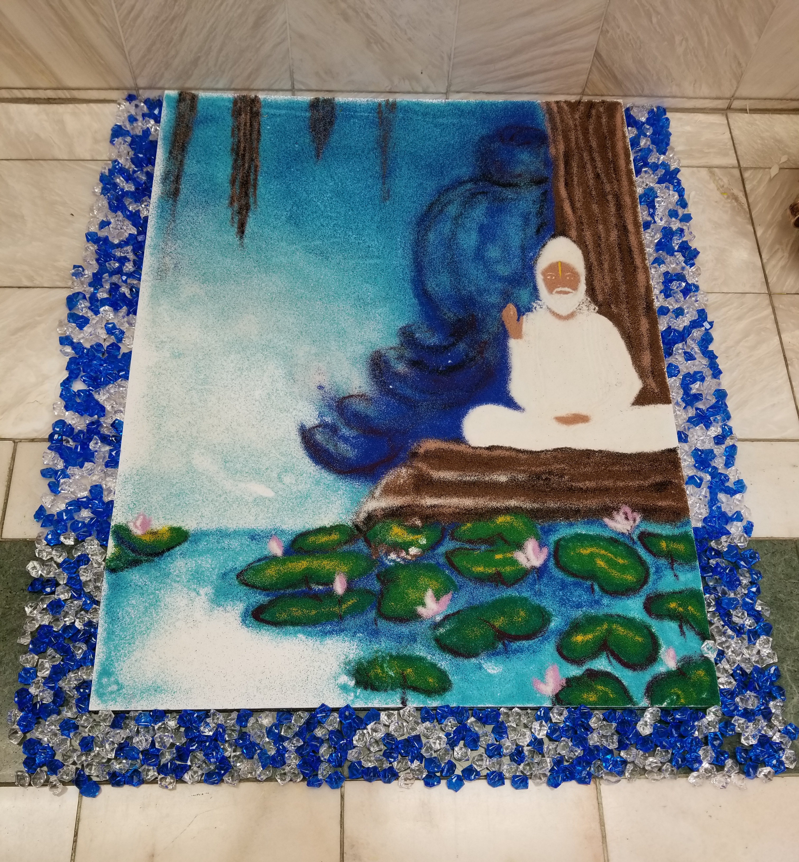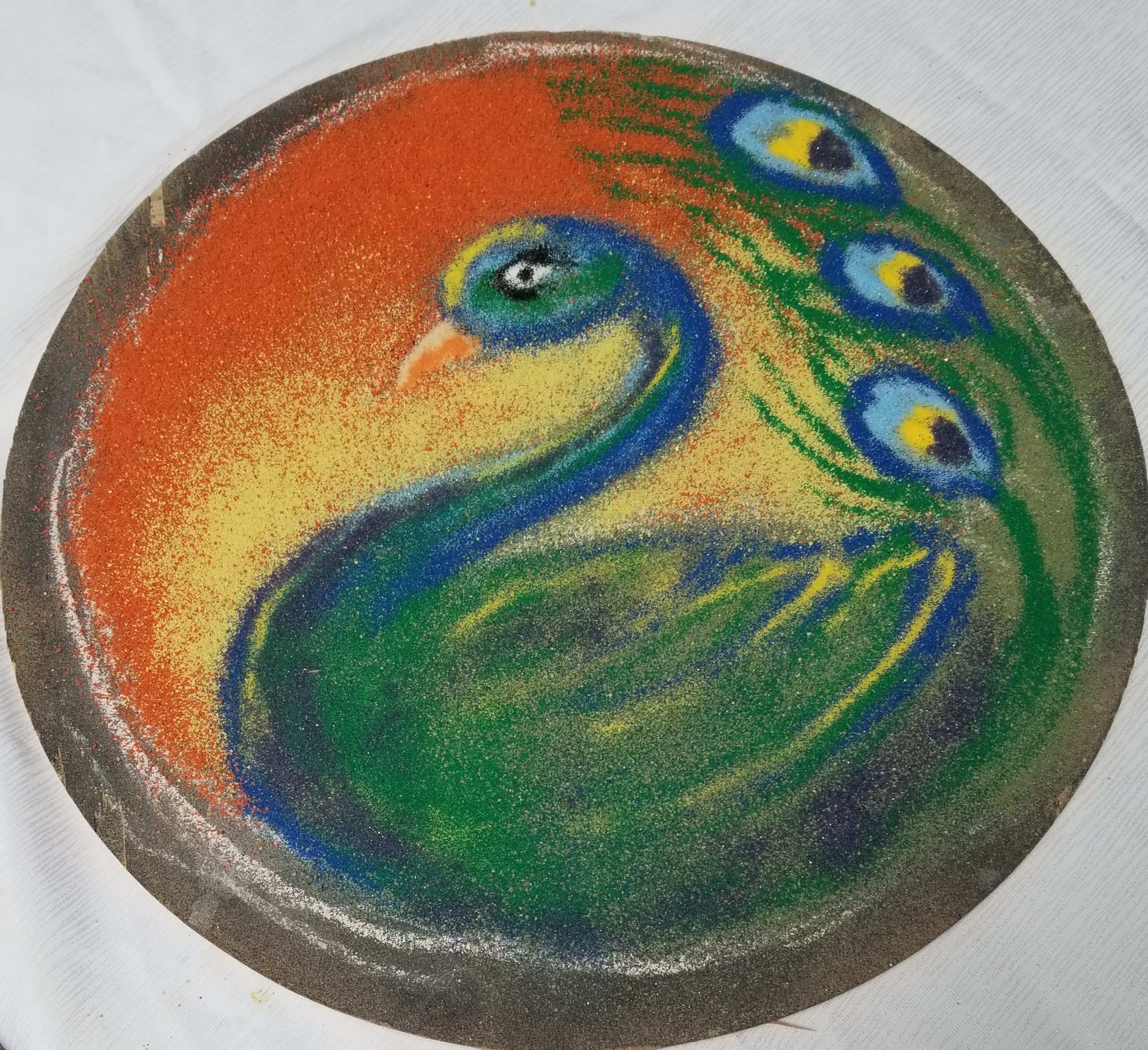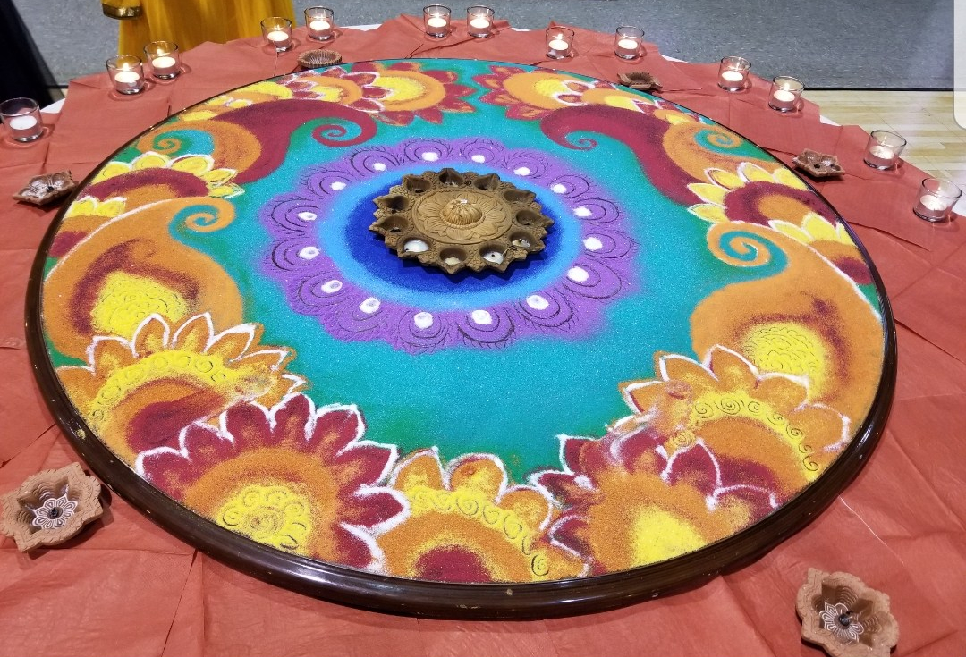 Rangoli is a design made with loose colored powder. Traditionally, every early morning women will sweep their homes and front porches then create rangoli on their front steps to welcome a new day. By mid-day it’s gone – swept away by the wind, as well as the coming and going of family, friends, and visitors.